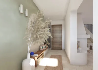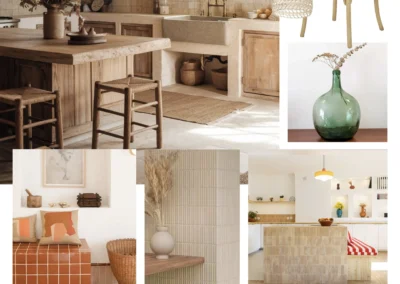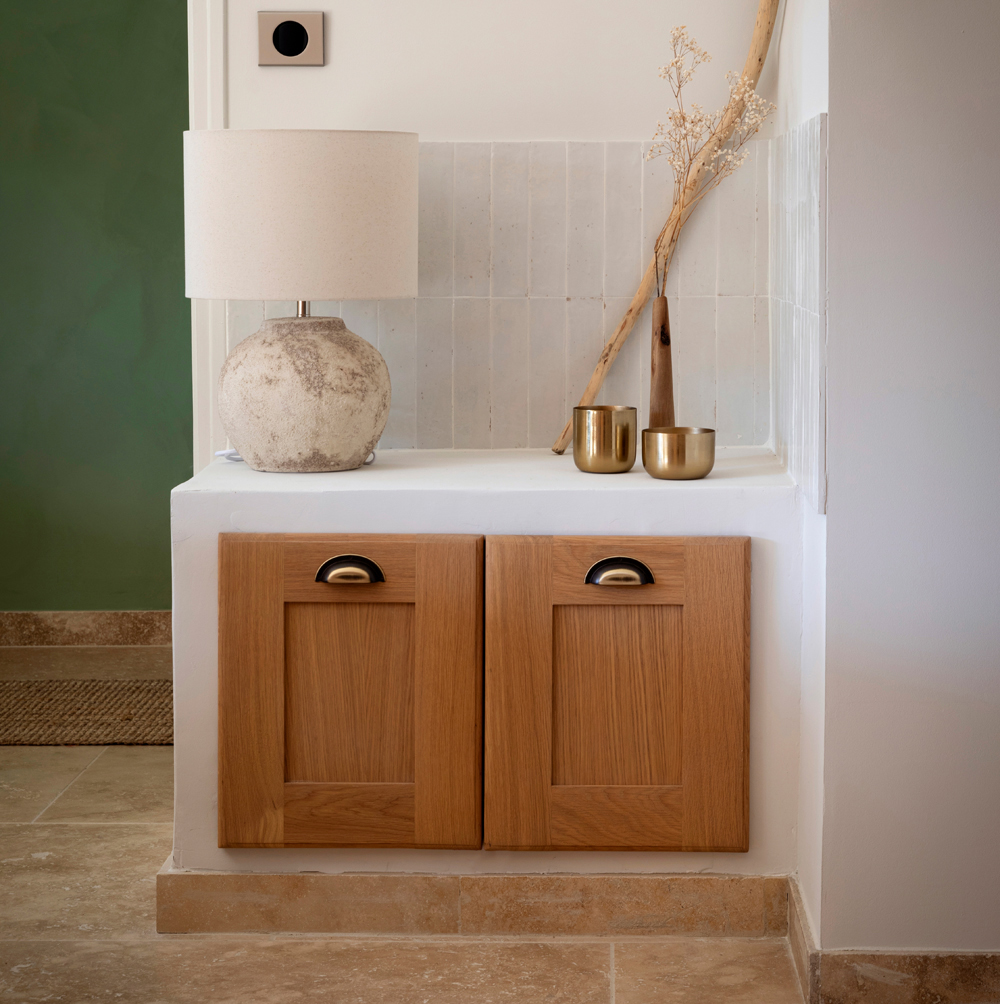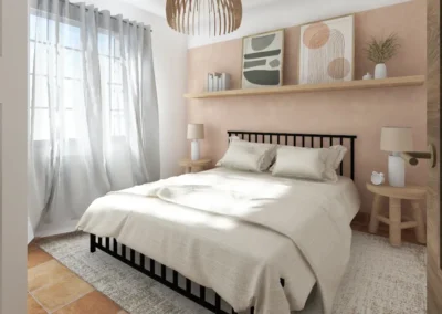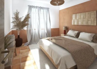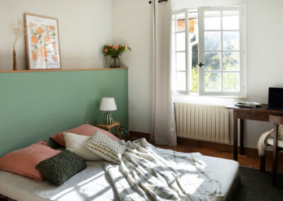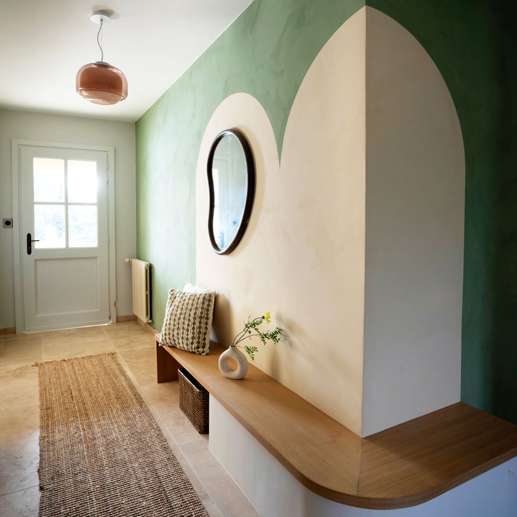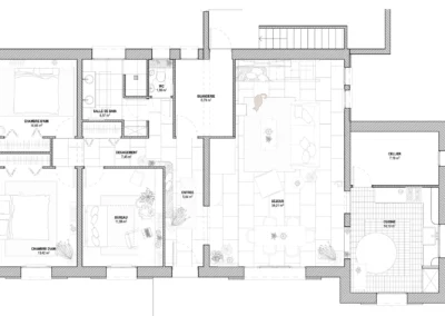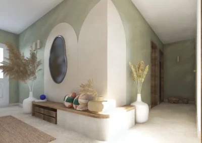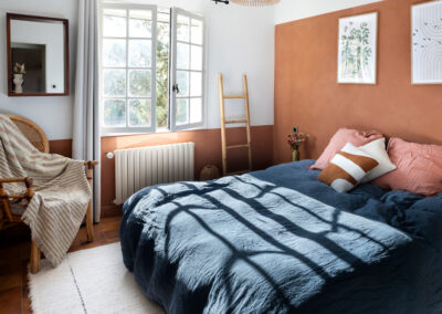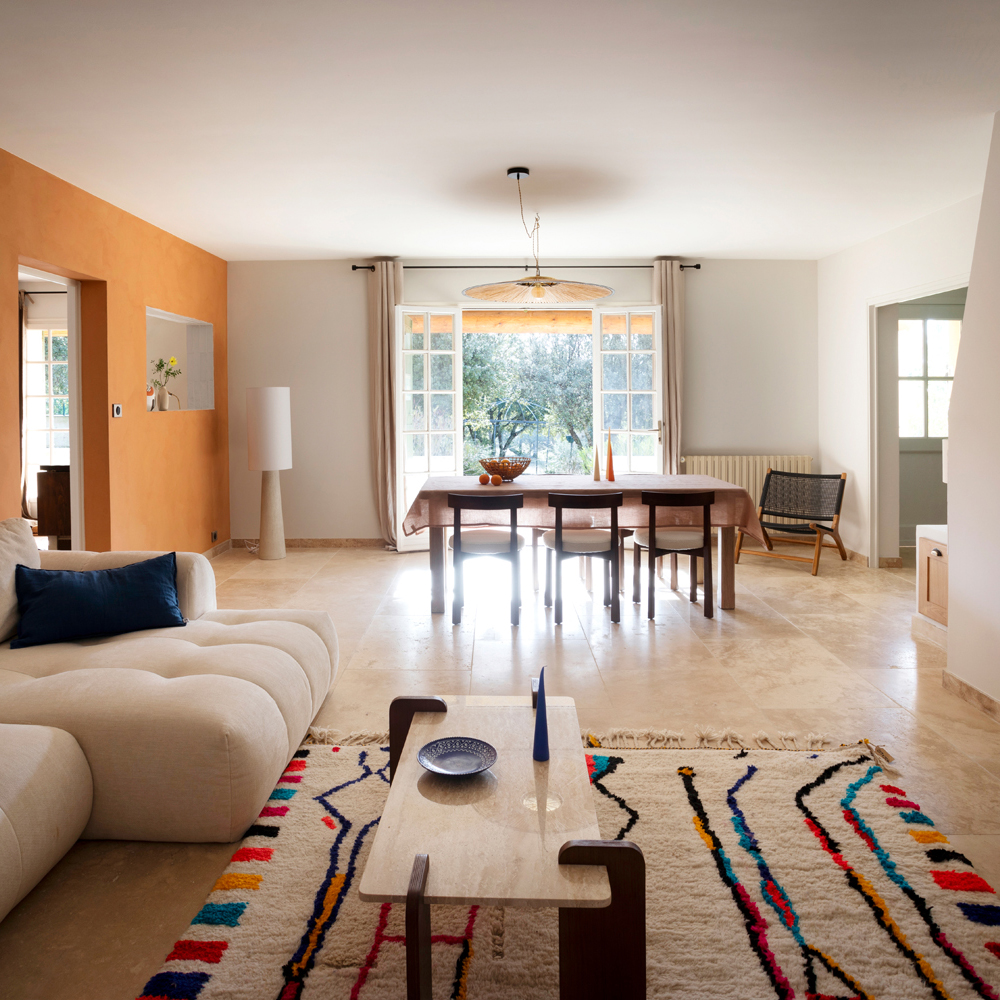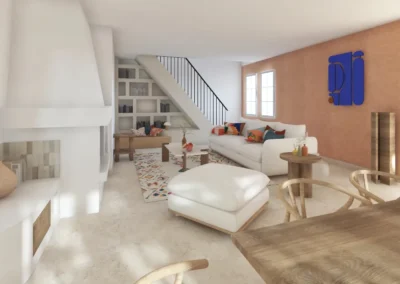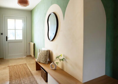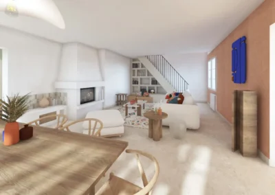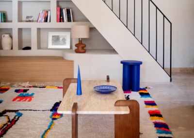 Le sol a été entièrement remplacé par un travertin aux nuances chaudes et subtiles, et les murs ont été enduits à la chaux pour une ambiance douce et minérale. Les pièces de vie comme les chambres, le séjour, la cuisine, le bureau, les WC et la salle de bain ont été repensées dans leur globalité, avec un changement complet du mobilier, sélectionné pour son esthétique, sa qualité et son écoresponsabilité.