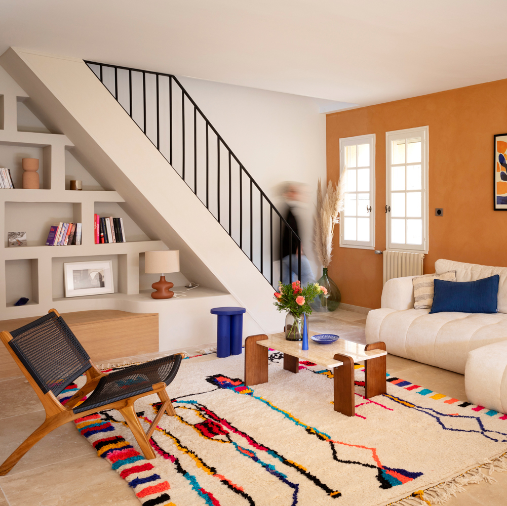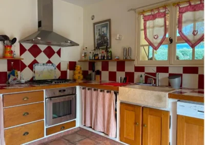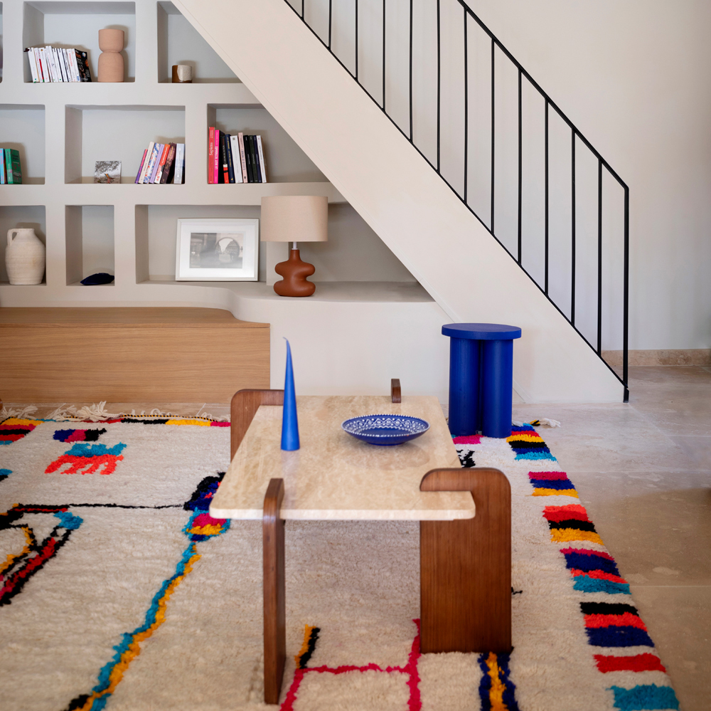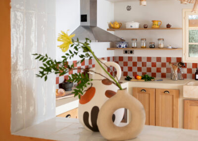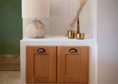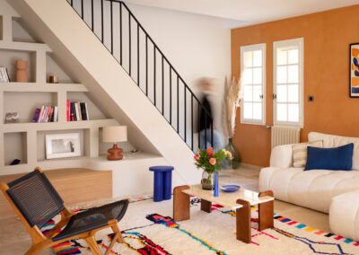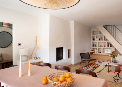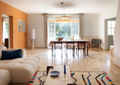 Des éléments sur mesure tels que des bancs intégrés, ou une bibliothèque dessinée spécifiquement pour le lieu, viennent renforcer l’âme unique de cette rénovation intérieure haut de gamme. L’ensemble compose un intérieur harmonieux, fonctionnel et intemporel, au service d’un art de vivre raffiné et ancré dans le paysage provençal.